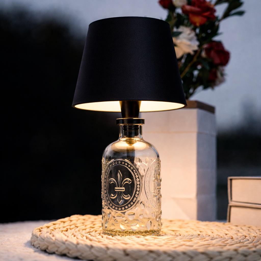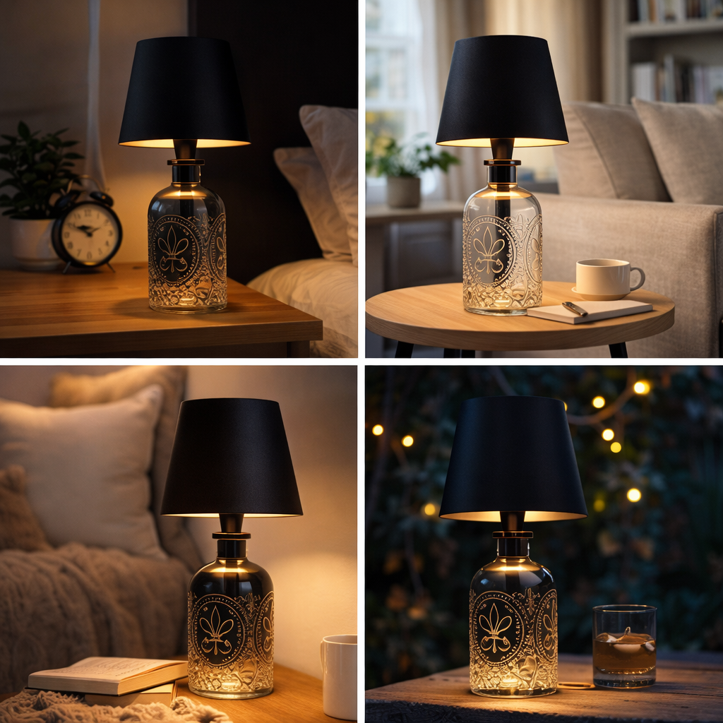 El yapımı dekoratif şişe masa lambası, sıcak ışığı ve modern tasarımıyla ev ve ofis dekorasyonuna şıklık katar.